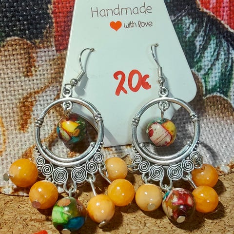 Handmade korvakorut, joissa on turkooseja ja helmiä. Korvakorut ovat kevyet ja sopivat erilaisiin asuihin. Materiaali sisältää korumetallia ja helmet. Korvakoruijen halkaisija on noin 2 cm. Voit katsoa Instagramissa @bijouterie_stones