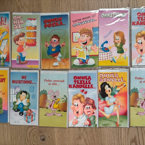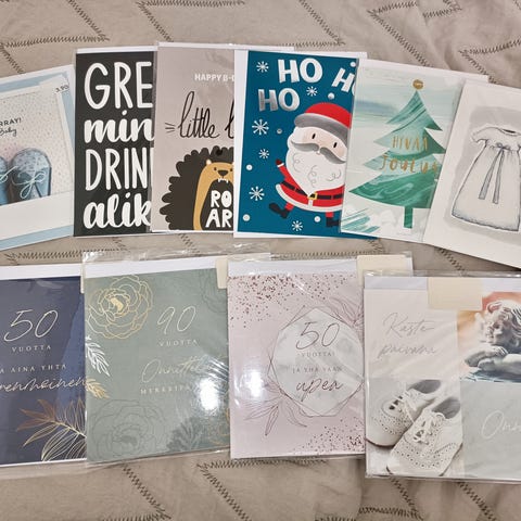 Erilaisia onnittelu ja muita postikortteja. Pinoissa 1-15 kpl. En myy erikseen.