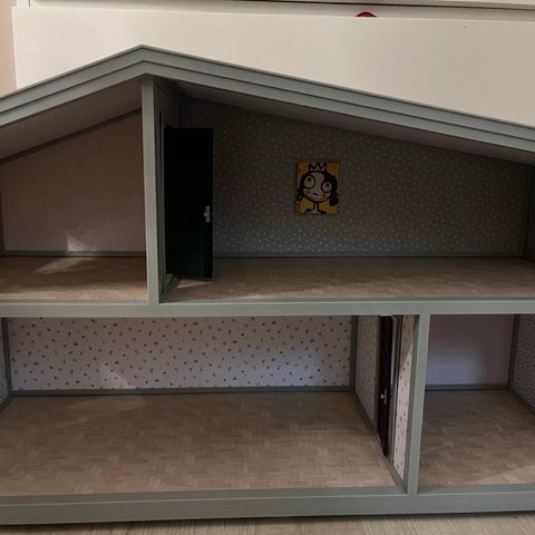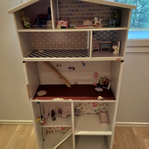 Hyväkuntoinen nukkekoti seuraavalle leikkeihin. Jotain pientä käytön jälkeä on parissa kohtaa.