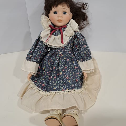 Le Mas des Aldries merkin nukke, jossa on sininen ja keltainen kukkakuvioinen mekko ja hattu. Nukella on vaaleat hiukset ja kasvoissa ommellut yksityiskohdat. Nukkeen kuuluu mekko ja hattu, jotka on valmistettu värikkäästä kankaasta, ne eivät irtoa.