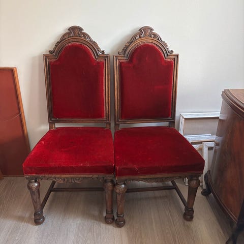 Iänmukaista kulumaa ja käytön jälkeä. Yhdestä tuolista puuttuu keskimmäinen selkänojan poikkipuu / puola - näkyy kuvassa