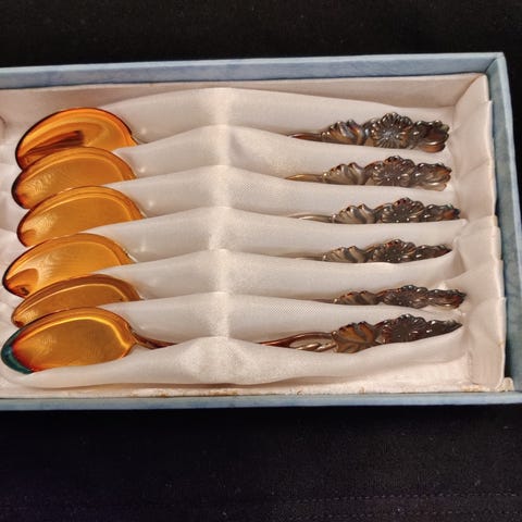 Lusikoissa on mm. hopean leima 830, tassu- ja kotkanpää- leimat sekä vuosileima X7=1975. Kaiverruksia ei ole. Mukana on myös rasia