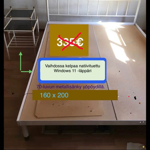 Varsin siisti puurunkoinen parisänky, ollut vierassänkynä. Mukaan kuuluu sänkyyn sopivat yöpöydät. Pieniä naarmuja jotka kuvissa. Nopeimmalle hakijalle. Sängyn osat irroitettu valmiiksi. Mitat: leveys 180cm, pituus 210cm, sängyn korkeus 39cm ja päädyn korkeus 106cm