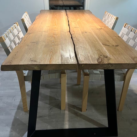 Myytävänä muutaman vuoden käytössä ollut rustiikkinen ja tyylikäs lankkupöytä. Valmistettu männystä ja viimeistelty petsilakalla. Puiset jalat. Kannen pinta tuo esiin puun syyt ja kuvioinnin.