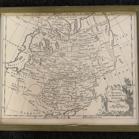 Kartta lasin alla. Lasin yläreunassa pari pientä iskemää. Kartassa iän tuomaa tummumaa. Tekstipuolelta näkyy että saanut joskus kosteutta.