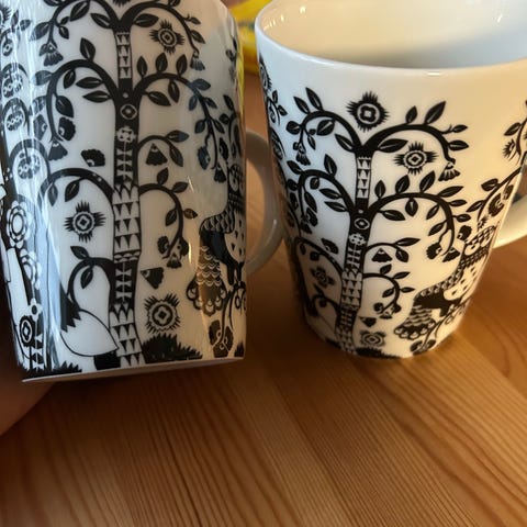 Iittala Taika mukit 0,4 l, 4 kappaletta. Mukit vitroposliinia, tarroja ei ole ja kuvausvalo on vaan kellertävä. Hyvässä kunnossa, harvoin käytössä olleet. Kpl-hinta 12€, jos otat kaikki niin hinta on yhteensä 40€.