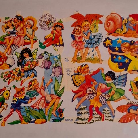6kpl vanhoja, hyväkuntoisia kiiltokuvia arkissa, aiheena keijut.