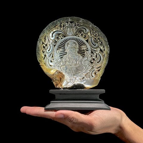 Täysin kaiverrettu suuri äidinhelmiä sisältävä simpukka, erittäin yksityiskohtainen. Simpukan veistos on ihmisen pääkallo. Simpukka on kaiverrettu balilaisen artesaanin toimesta, joka on hallinnut veistotaidon. Tämä artesaani on yksi harvoista, jotka pystyvät veistämään näin korkealla tasolla. Hän on todellakin yksi parhaista ja tunnetuimmista tällä alalla. Simpukka toimitetaan puisen jalustan kanssa.