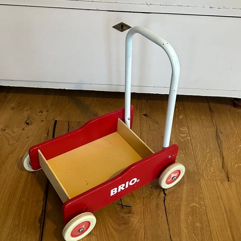 Taaperokärry hankittu lidlistä ja törröttävät ruuvit peitetty kuumaliimalla.