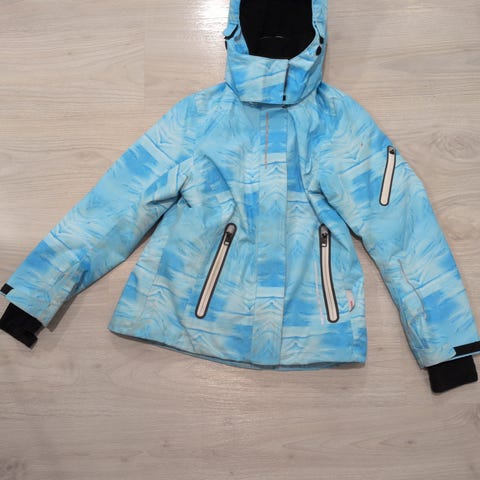 Myydään seuraavalle kahden hiutaleen toppatakki. Takki on siisti ja ehjä, mutta kankaassa näkyy käytön jälkiä. Huppu on kadonnut.