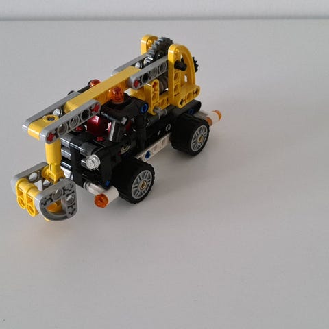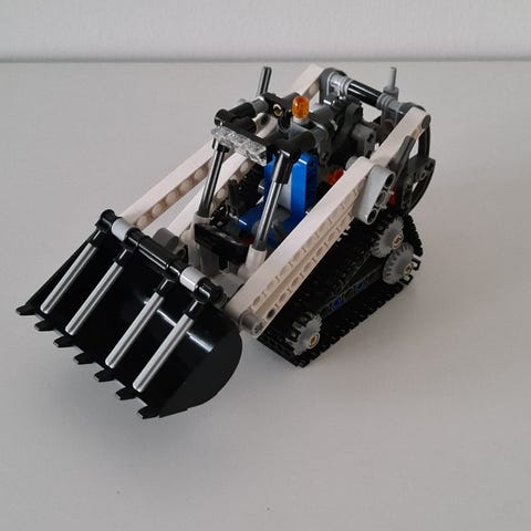 Tästä hyvää kiertotaloutta tukevaa lahjaa pukin konttiin. Valmiiksi purettu Lego Technic 42060. Aura-autoon kaikki palat tallessa, Lava-autosta kaivinkoneen kera ei takuuta.