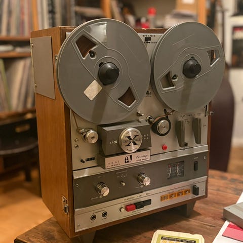 Akai 1710 kelanauhuri 1960-luvulta. 4-raita stereo putkivahvistimella. Kolme nopeutta 19, 9,5 ja 4,75. Kaksi valitaan säätimellä ja yksi siirtämällä paksumpi holkki capstan tappiin. Päädyissä sisäiset kaiuttimet. Max 7 tuuman kelat käyvät. Ollut varastoituna jonkin aikaa ja nyt soiteltu vähän. Tuntuisi toimivan ihan ok, toisto, kelaukset ja nauhoitus. Kelojen akselien kumitutteja en enää löytänyt, pysyvät kyllä paikoillaan ilmankin (8 mm bensaletkusta saa sopivat pätkät). Pieni putkilaitteen pohjahumina kuultavissa. On sitten painava laite, 15 kg. Siisti laite. Aikakautensa maadottamaton pistorasia paikallaan.