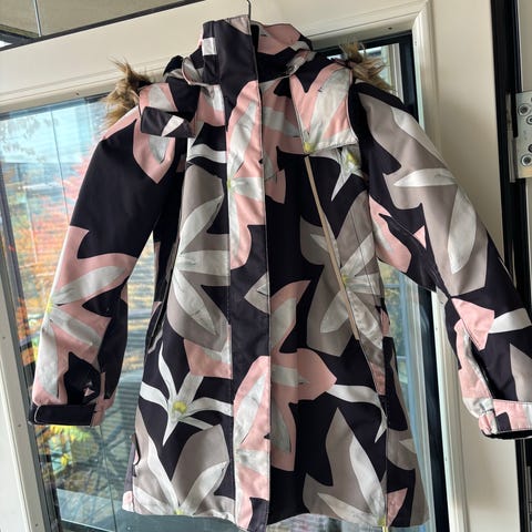 Myydään lämmin toppatakki seuraavalle ulkoilijalle. Kahden hiutaleen, siisti ja ehjä takki. Hupussa karvareunus.