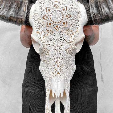 Suuri käsin kaiverrettu vesipuhvelin pääkallo, jonka ovat kaivertaneet taiteilijat, jotka ovat siirtäneet muinaisen kaiverrustaidon isältä pojalle. Kallo on täysin käsin veistetty suurella huolella. Se on epätavallinen, koristeellinen kappale.