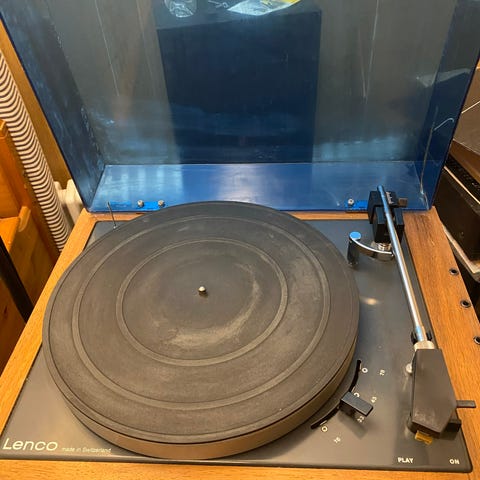 Vanha puukuorinen levysoitin. Äänijohdot liitetty sähköteipillä, koska oli kuoret murtunu huonoksi. Laitettavaa on jos priiman haluaa, mutta on siisti näinkin ja kuuluu musiikkia lp:ltä. Ikää en tiedä mut veikkaan 70-luvun alkupuolelta tai vanhempikin voi olla.