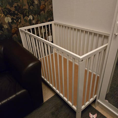 Pinnasängyn laidan saa nostettua ja laskettua helposti. Rungon mitat 128.5 x 67cm, korkeus 92cm. Sänkyyn sopii 120x60cm patja. Kuvan patja tai reunapehmusteet eivät tule mukaan.