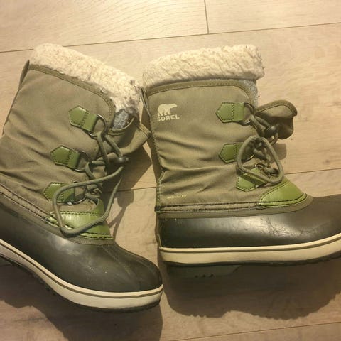 Sorel lasten talvikengät, koko 35, unisex. Väriltään harmaat ja mustat, varustettu sinivihreillä nauhoilla. Kengissä on lämmin vuori ja kumipohja, jotka sopivat kylmiin olosuhteisiin. Kunto hyvä, käytetty