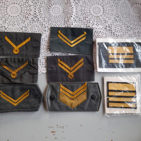 Myydään aidot suomalaiset sotilasarvomerkit, kapteenin arvo. Vanhempaa kangaspohjaista mallia. Vastaa Suomen armeijan vanhempaa kenttä-/maastopukukäytössä ollutta mallia. Kunto käytetty hyvä. Patinaa, kulumaa ja irtolankoja löytyy hieman. Palveluskäytössä ollut kunto. Tarranauha kiinnitys
