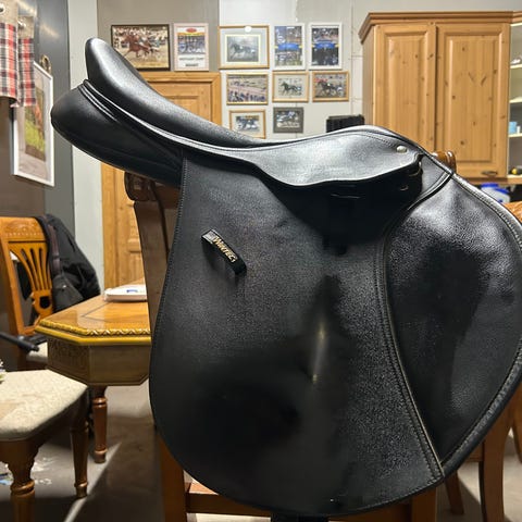 Moitteettomassa kunnossa oleva estesatula. Vastinhihnat vaihdettu nahkasiin. Ilmatoppaus. Sisällä nyt valkoinen kaari.