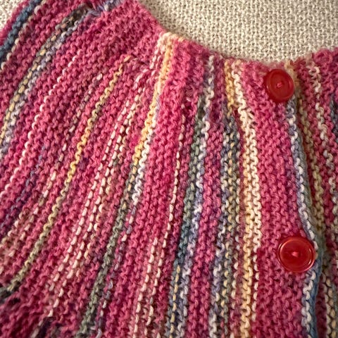 Saimme tänään valmiiksi viimeisen joulutilauksemme. Se oli neulottu rakkaalle Marialle. Kaksivuotias villainen neuletakki röyhelökauluksella.