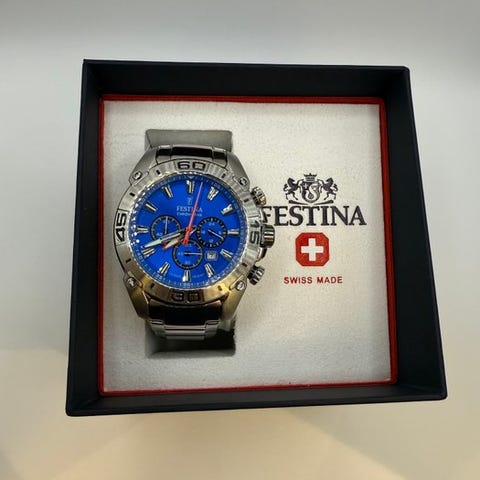 Elegantti ja ajaton Festinan naistenkello ilmentää klassista sveitsiläistä käsityötaitoa ja ripausta modernia hienostuneisuutta. Kullattu ruostumattomasta teräksestä valmistettu kuori ja ranneke huokuvat ylellisyyttä, kun taas valkoinen kellotaulu arabialaisine numeroineen ja herkät siniset viisarit luovat hienostuneen kontrastin.