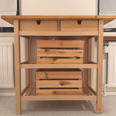 Myydään vähällä käytöllä ollut ikean sivupöytä/tarjoiluvaunu. Kunto hyvä, kannessa pieniä käytön jälkiä jotka näkyy kuvassa. Materiaalina massiivipuu, eli saa hiomalla näyttämään taas upouudelta.