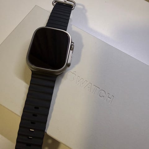 Apple Watch Ultra älykello, jossa sininen ranneke. Möin pois kun hommasin Garminin tilalle. Kello soveltuu monipuoliseen käyttöön ja sisältää useita älytoimintoja, kuten ajan näyttö ja terveysmittarit.