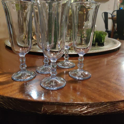 Kuohuviinilasit, antiikkia, joissa on kaiverrettu koriste. Lasin materiaali on kirkas lasi. Sopii kuohuviinin tarjoiluun. Myydään yhdessä tarjottimen kanssa. Tarjottimensa pienet jalat