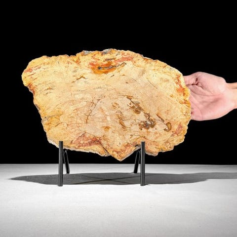 Upea kivettyneen puun viipale räätälöidyllä jalustalla.