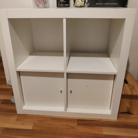 Ikean hyllykkö, kulumaa on ainakin toisessa reunassa, ollut joskus se kylki lattiaa vasten, nyt pystyssä. Mukaan saa muutaman valkoisen kangaslaatikon. Mittoja saa pyydettäessä. Mielellään nopea nouto!