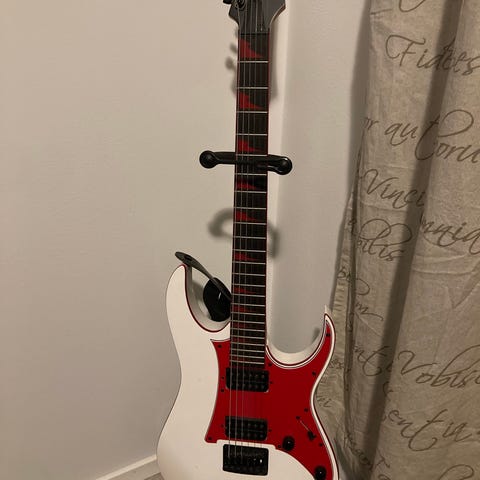 Täydellinen paketti, sisältää kaikki kaapelit ja kitaratelineen.