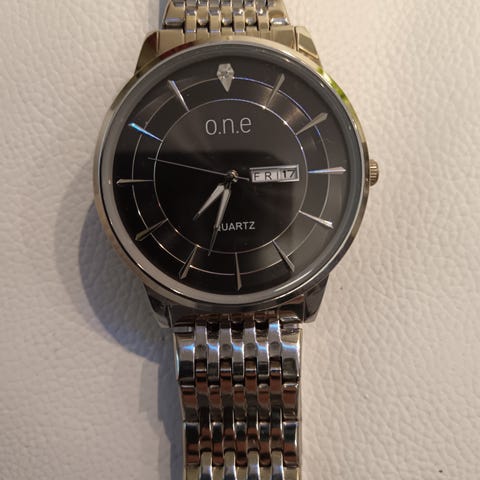 Toimiva miesten rannekello, jossa on musta metalliranneke ja harmaa kellotaulu. Kellossa on kronografitoiminnot, päivämääränäyttö ja pyörivä kehä. Menee noin 20cm ranteeseen. Kuvissa 19cm ranne ja kaksi linkkiä irti. Leveys ilman nuppia 46mm. Lug to Lug 55mm. Korkeus 13mm