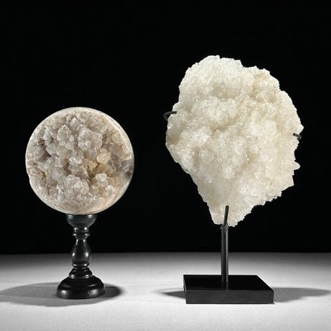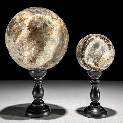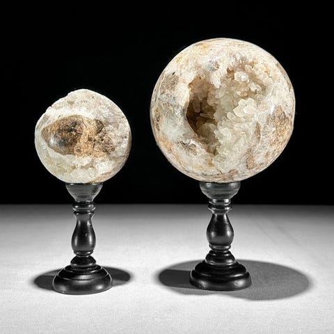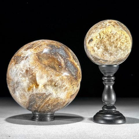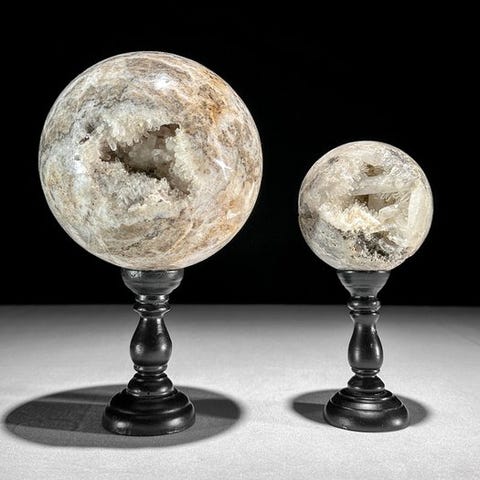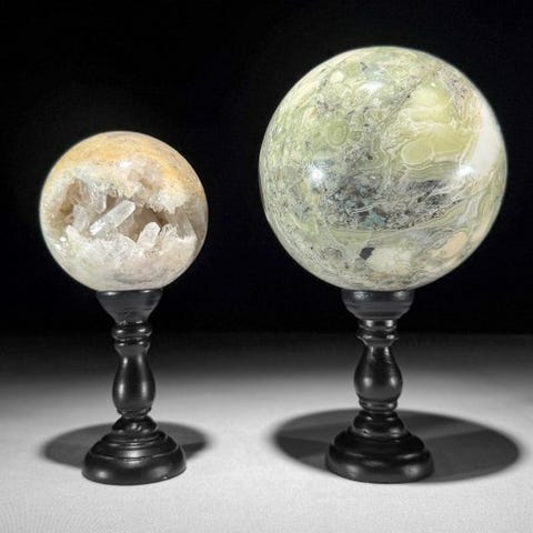 Kauniit kristallikvartsipallot kustomoidulla jalustalla.