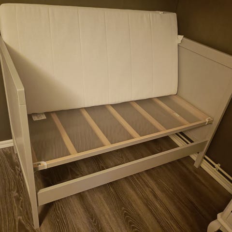 Myydään IKEAn puinen Sniglar-pinnasänky ja patja. Sänky melkein uudenveroinen, ei tahroja, naarmuja tai hampaanjälkiä. Pohja asennettavissa kahteen eri korkeuteen, joten sopii vastasyntyneestä taaperoon. Sänky on kevytrakenteinen ja helppo liikutella ja koota. Sänky myydään osiin purettuna (kasaamisohjeet saatavissa Ikean sivuilta, linkki alla). Patjassa pientä käytön jälkeä, mutta ei silmiinpistäviä tahroja. Patjan päällinen pestävissä 60 asteessa, luovutetaan pestynä. Halutessasi saat kaupan päälle kaksi muotoonommeltua, siistikuntoista aluslakanaa, joissa pieni pallokuviointi.