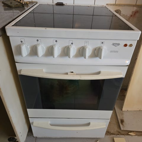 Annetaan UPOn 50cm leveä keraaminen liesi, jossa on neljä keittoaluetta ja uuni. Vanha, mutta toimiva.