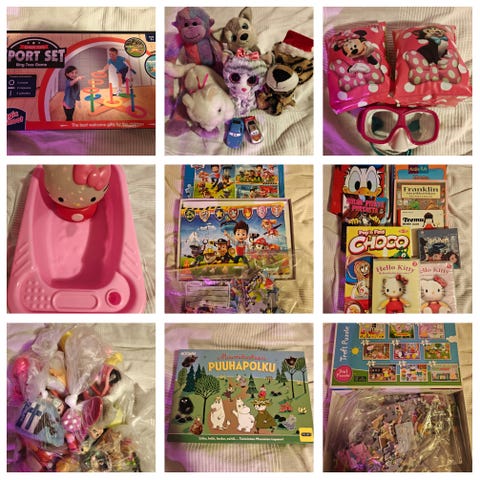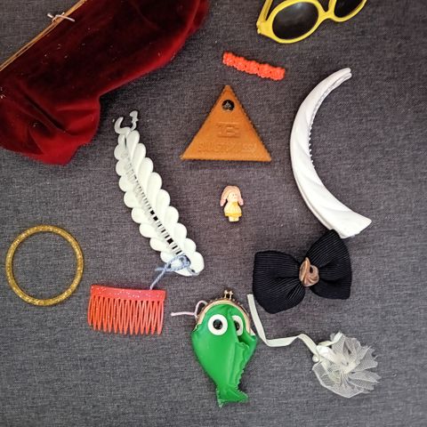 Erilaiset kuviosakset, kuplajuttu, maapalloteroitin, pikkuinen muovikori ja metalliset purkit