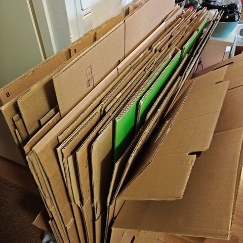 Osa kahteen kertaan käytettyjä ja osa kerran. Suurin osa isoja laatikoita ja ihan muutama pienempi. Ikeaa, Rustaa, Clasua, Muuttohaukkaa sekasin.
