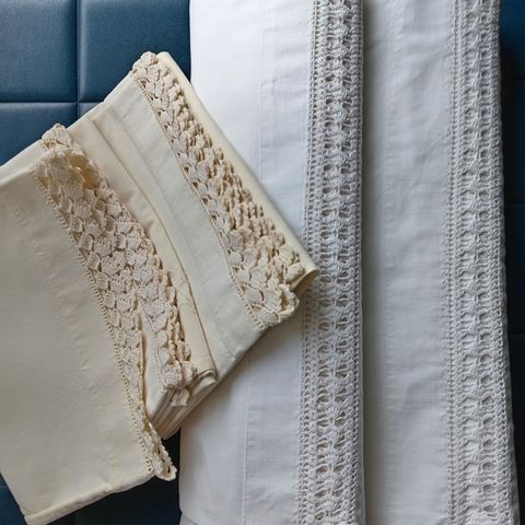 Vanha, tukevaa lakanakangasta oleva peiton päälilakana ja tyynyliina, joissa itse virkatut pitsit ja tyynyliinassa pitsin lisäksi käsin ommeltu kauniis kuvio.