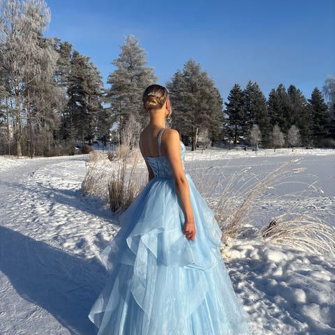 Koon 42/44 wanhojen mekko. Takana nyörit, joten on helppo kiristää ja löysentää. Ite oon 168cm ja käytin tennareita, joten aika sopivan mittainen