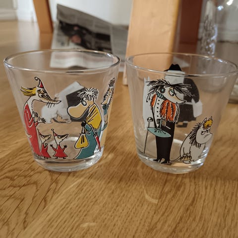 Iittalan Muumi Kultainen häntä & Muumi ja marsilaiset (2010-2012) -juomalasit, kuusi kappaletta. Lasit ovat valmistettu kirkkaasta lasista ja koristeltu Muumi-hahmoilla eri väreissä.
