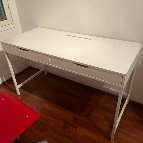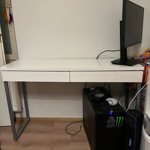 Valkoinen työpöytä kahdella vetolaatikolla. Vetolaatikot liukuvat hyvin auki. Pöydän pinnalla muutama pieni jälki, mutta muuten hyvässä kunnossa oleva työ/meikkipöytä.