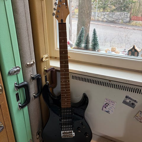 Musima strato ja mukaan toinen musima kaula. Irtokaula on ohuempi profiililtaan. Kaikkiaan yllättävän hyvä soundinen kitara, jonka virittimet vaihdettu fenderin virittimiin. Alkuperäiset sähköt ja mikit. Näiden mikit on maailmalla tykättyjä. Mikkikytkin vaatii voitelua, muuten ei mitään sanottavaa. Kaulaprofiili aika tuhti, lakkoja hiottu kaulan talaa pois. Vain nouto.