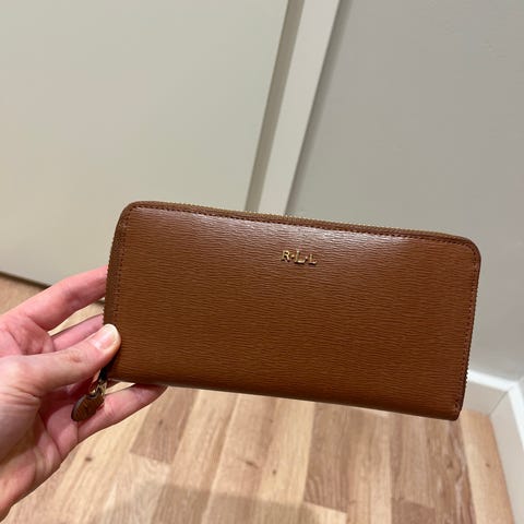 Ralph Lauren nahkainen lompakko. Musta väri. Lompakossa on vetoketjukiinnitys, useita korttipaikkoja ja keskellä vetoketjullinen kolikko-osasto. Sisäpuoli on koristeltu Lauren Ralph Lauren -tekstillä. Kuin uusi.