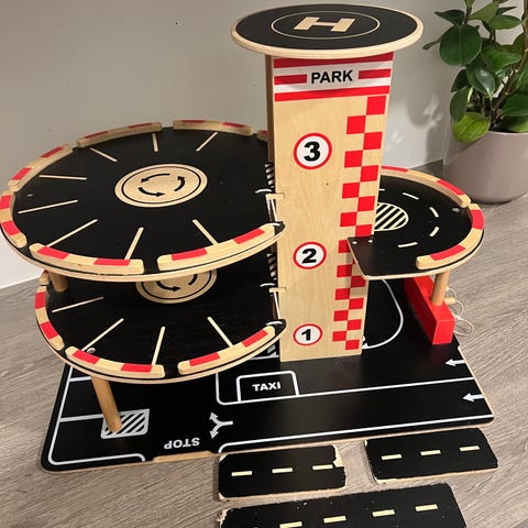 Kolme kerroksinen parkkitalo, mukaan kuuluu autoja ja helikopteri