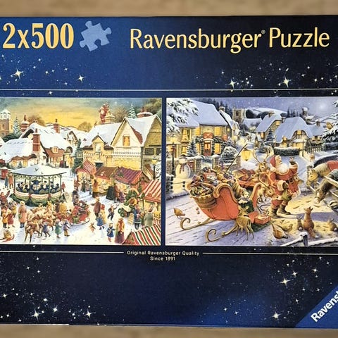 Ravensburger merkkinen laadukas palapelipaketti 2 kpl 500 palapeliä. Uutena ostettu ja kerran tehty uudenveroinen laadukas palapeli. Kaikki palat tallella. Kiva joulupeli. Joulutori, kuoro ja ihmiset markkinoilla. Joulupukki, reki, lahjat, porot, hevoset ja muut eläimet syömässä.