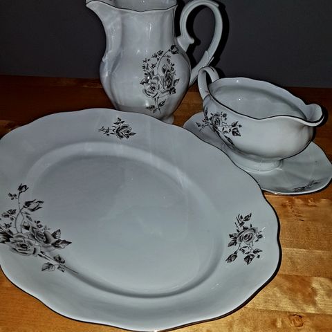 8 kappaleen astiasto, muuten ehjä mutta kermakossa nokka rikki, näkyy kuvissa