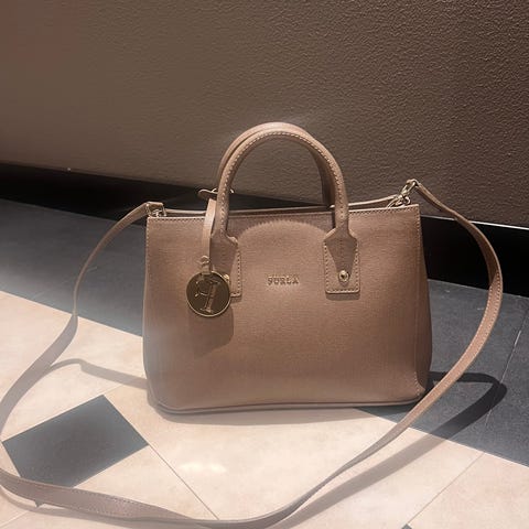 Kaunis laadukas beigen värinen Furlan käsilaukku dustbagilla. Laukku on valmistettu nahasta ja sisältää kaksi kantokahvaa sekä irrotettavan olkahihnan.