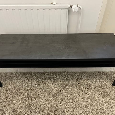 Tv-taso/suvupöytä, jossa alhaalla ”kaukalo” tavaroille. Tampere/Vuores.