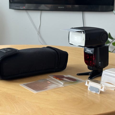 Erinomaisessa kunnossa oleva salama Nikonille. Taittuva pää, valonhajotin mukana.