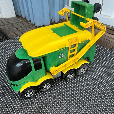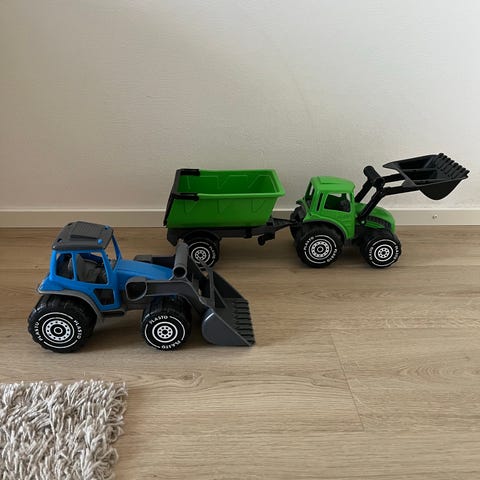 Plaston lavetti ja vetoauto, pyöräkuormaaja, traktori ja betoniauto. Kaikki autot leikittyjä, mutta ehjiä